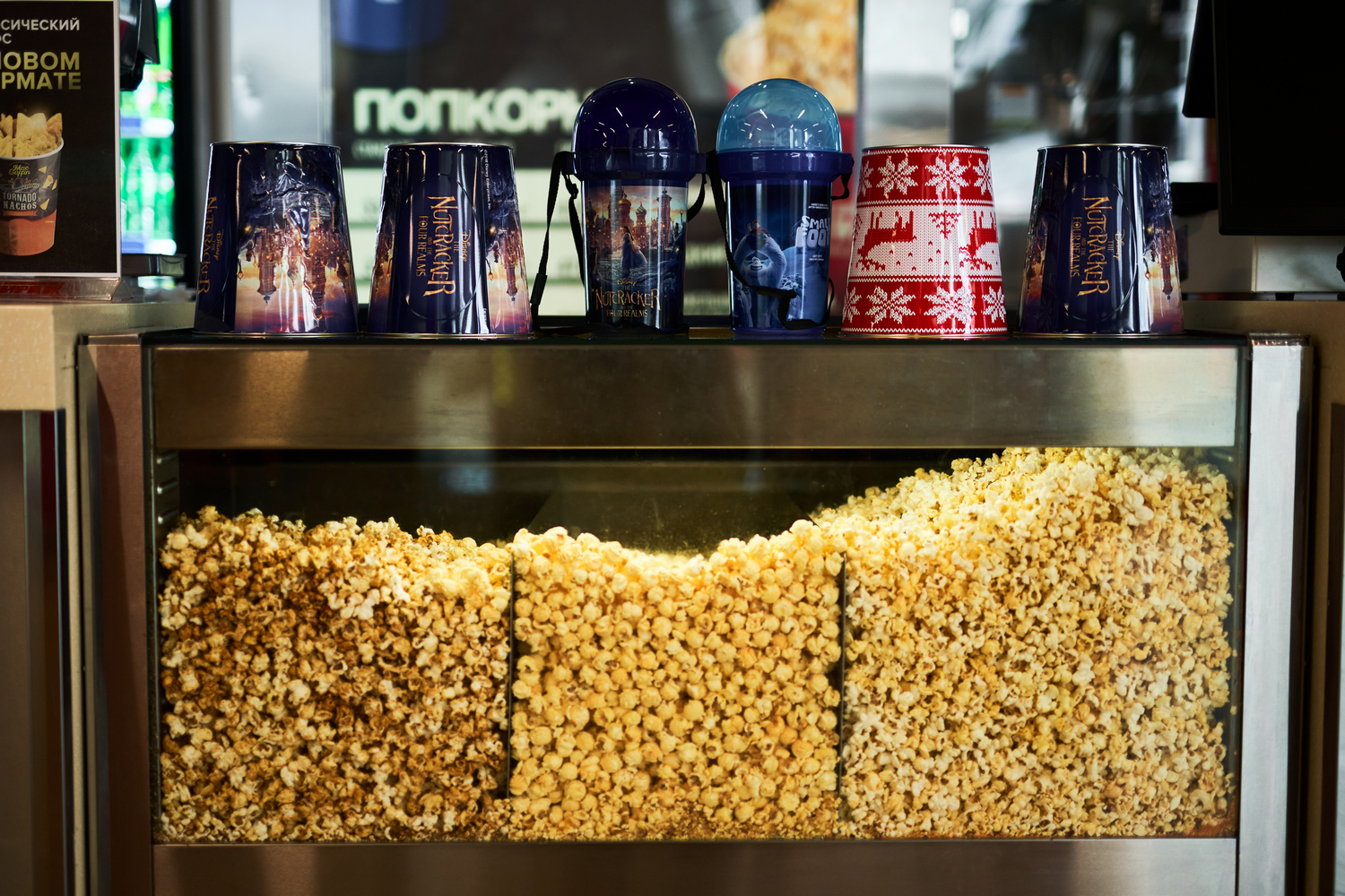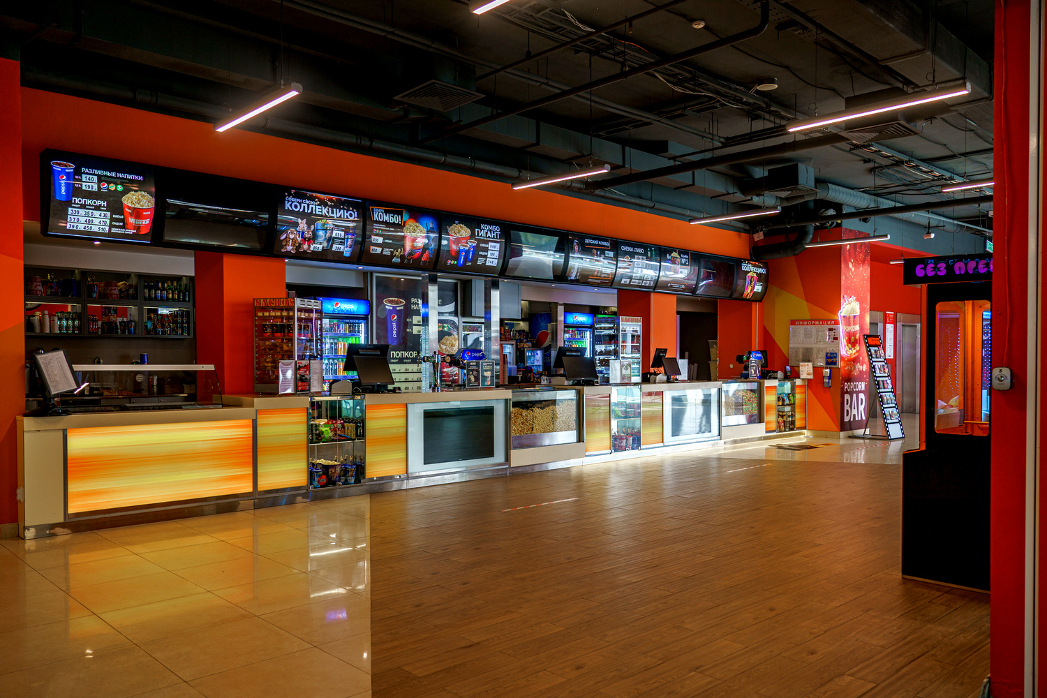 В кинотеатре вас ждёт привлекательный попкорн-бар с четырьмя кассами обслуживания и широким ассортиментом попкорна и напитков. Меню можно найти на специально оборудованном экране, либо за стойкой. Дружелюбные бармены всегда готовы прийти на помощь и дать совет относительно выбора закуски или напитка.