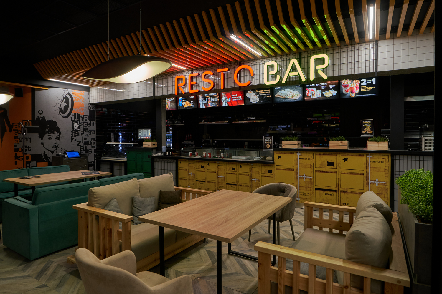 Дизайн. Мягкие диваны нежного бежевого и благородного малахитового цветов, сочетание оттенков свежеобструганного и состаренного дерева, оформление стен стилизованными рисунками постеров с самыми знаменитыми актерами: уютный и стильный интерьер для романтического вечера … и для классных фоток в Инстаграм.