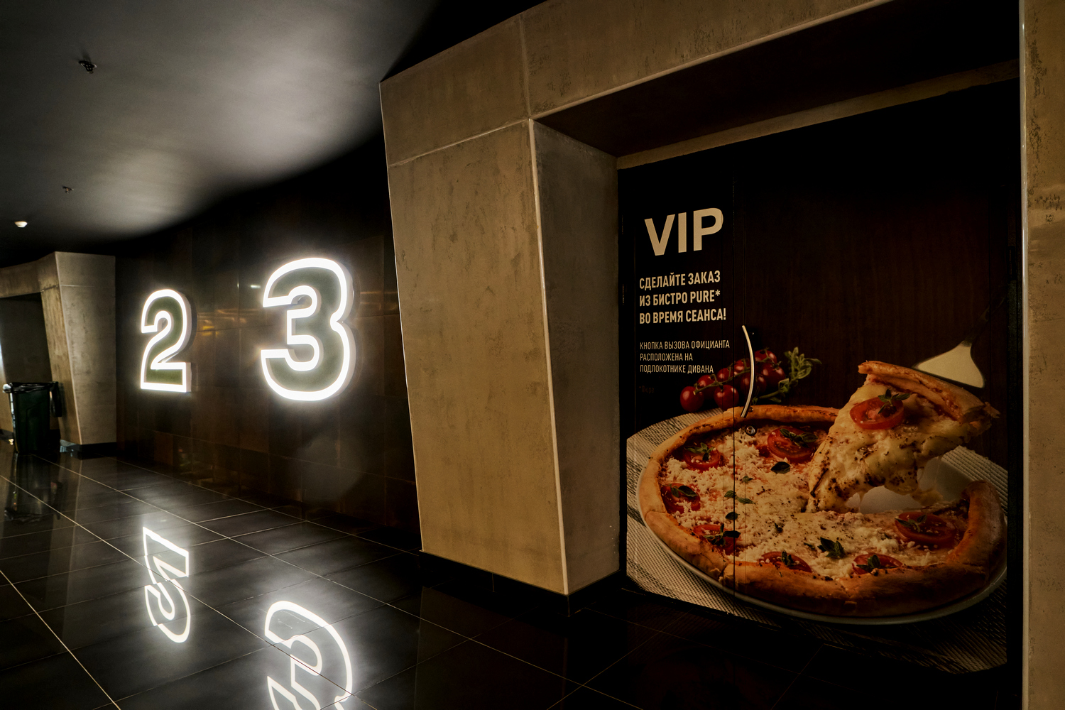Заказ блюд в зал. Гости могут вызвать официанта в зал (кнопка вызова расположена у каждого дивана), заказать блюда и напитки из меню бистро и наслаждаться хорошим фильмом и вкусной едой. При желании гостей выносятся дополнительные столики.