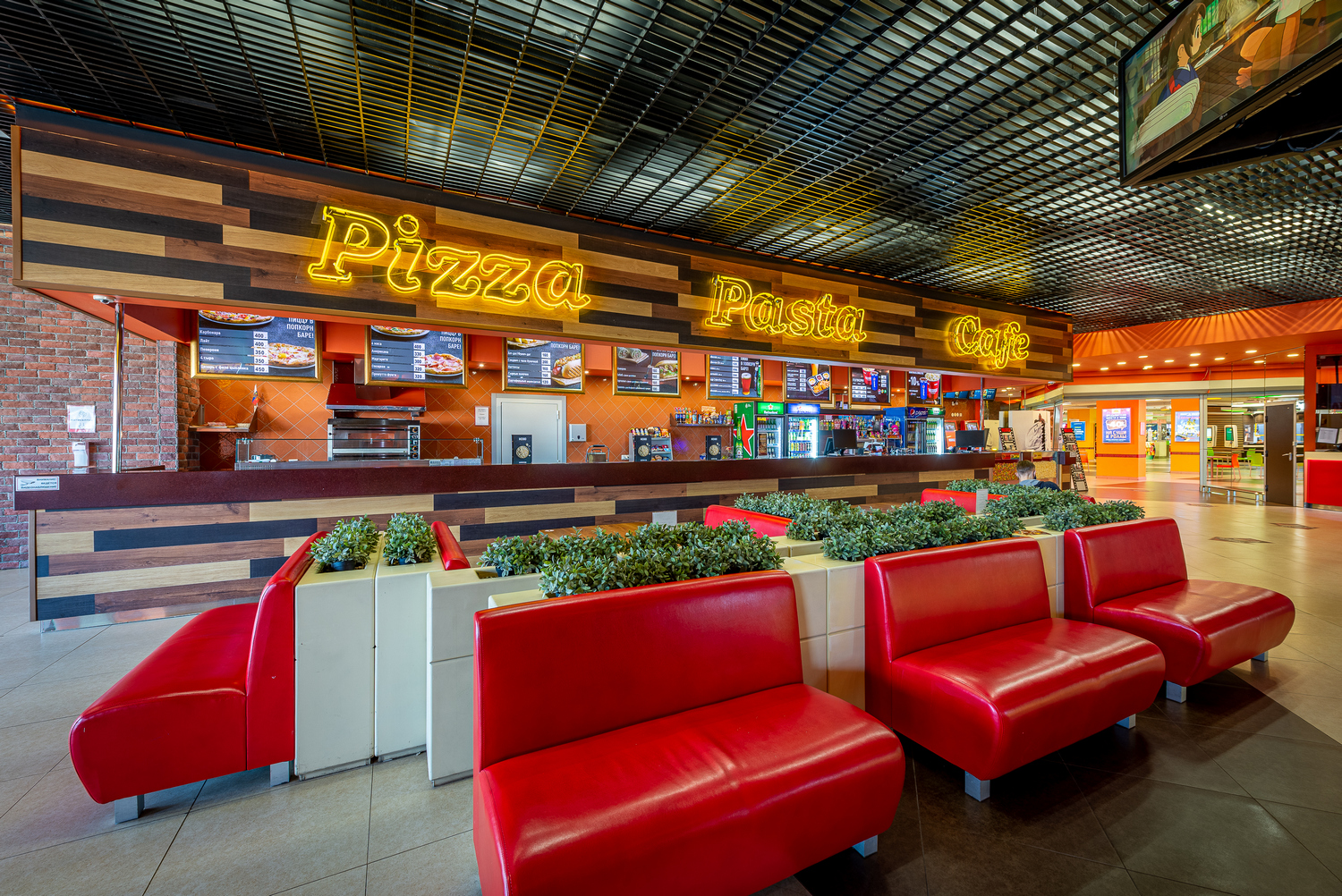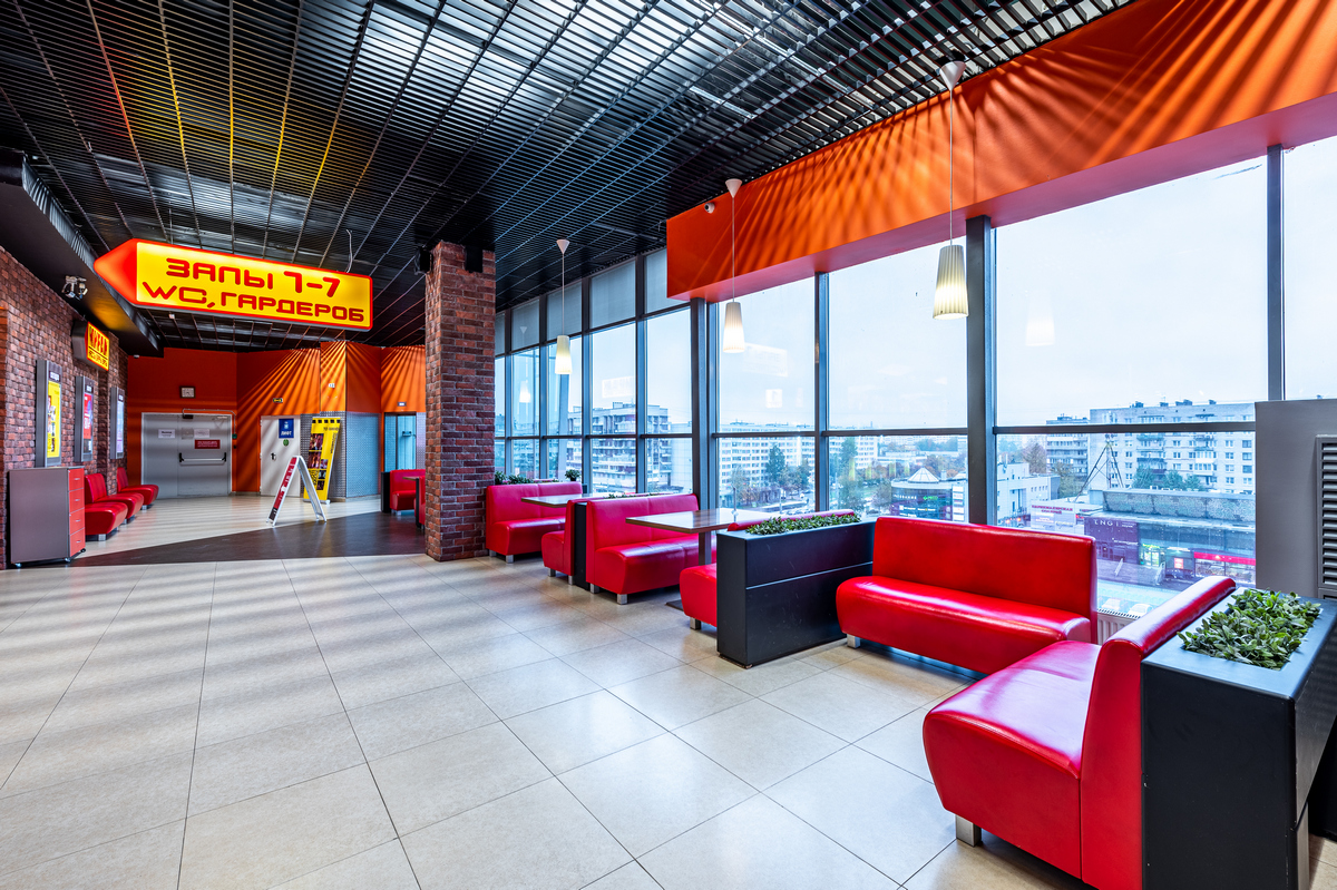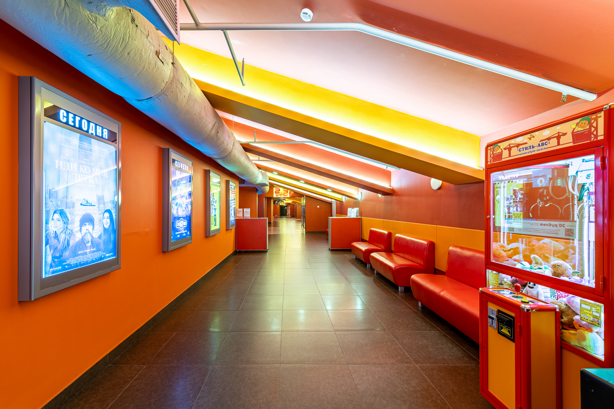 В кинозалах черные стены с красной подсветкой создают завораживающую мистическую атмосферу